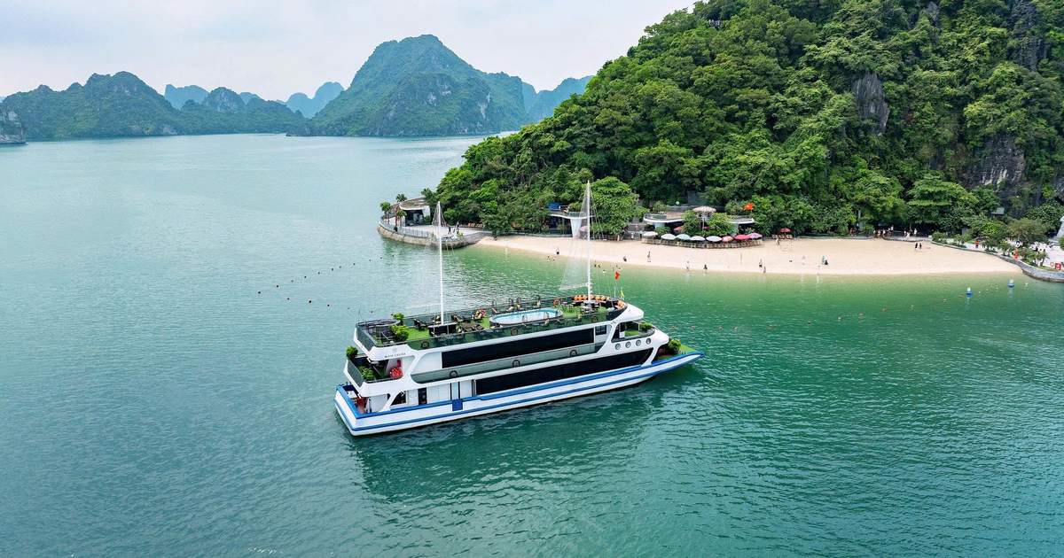 下午,游船将前往卢昂洞,游客可在此体验约30分钟的皮划艇。之后,游船将继续前往下龙湾最大、最美丽的洞穴——惊奇洞,进行45分钟的探索。随后,游船将在蒂托夫岛停靠,您可以攀登至半山腰,欣赏海湾全景。返回游船后,您可以在阳光甲板或按摩浴缸中放松身心,享用日落派对,品尝越南茶、蛋糕、新鲜水果和小吃。返程途中,游轮将经过华强(Hoa Cuong),这是海湾中最美丽的景点之一。行程最后返回团洲港(Tuan Chau Harbour)。之后,您将被送回河内酒店。